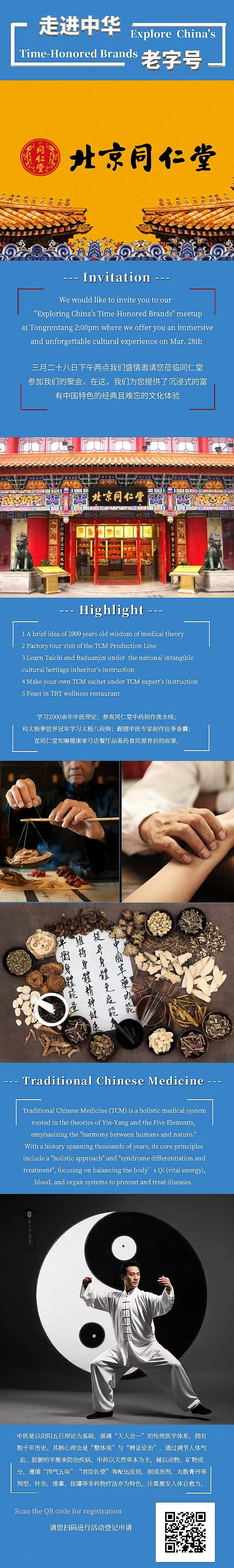 2025年“走进中华老字号”系列活动的第三站,将走进中华老字号北京同仁堂,沉浸式学习体验博大精深的中医文化。欢迎各界中外友人扫描下方二维码报名参与!