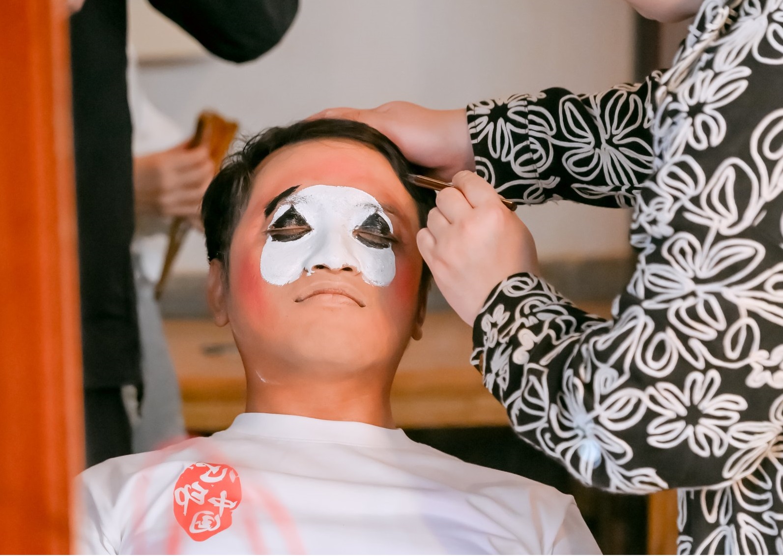 异域面孔敷上东方油彩,杨贵妃妃色醉颊,眼尾飞金;高力士鼻头一抹白,裴力士眉间一团灰;宫女们两颊晕开胭脂云。一笔一笔把高梁深目改成粉墨春秋。